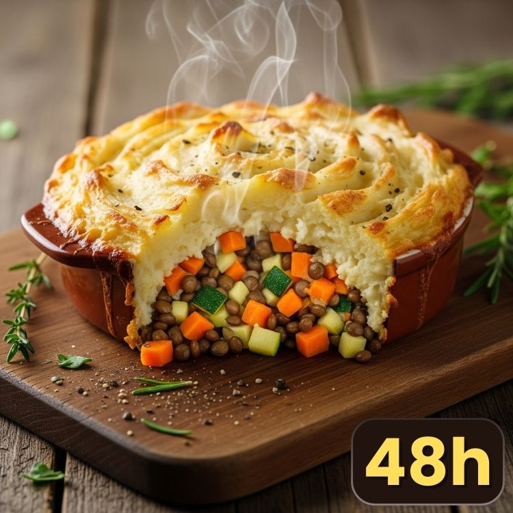 Purée gratinée et savoureuse, sur sa couche fondante de légumes mijotés, accompagnée d’une salade croquante.