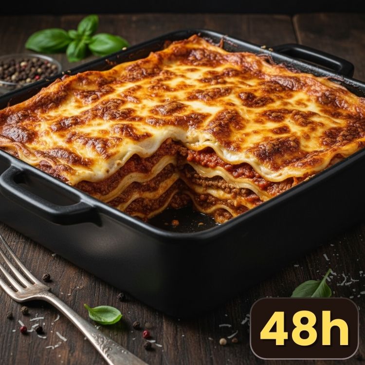 Lasagnes généreuses à la bœuf, sauce tomate maison et couches de béchamel fromagère.