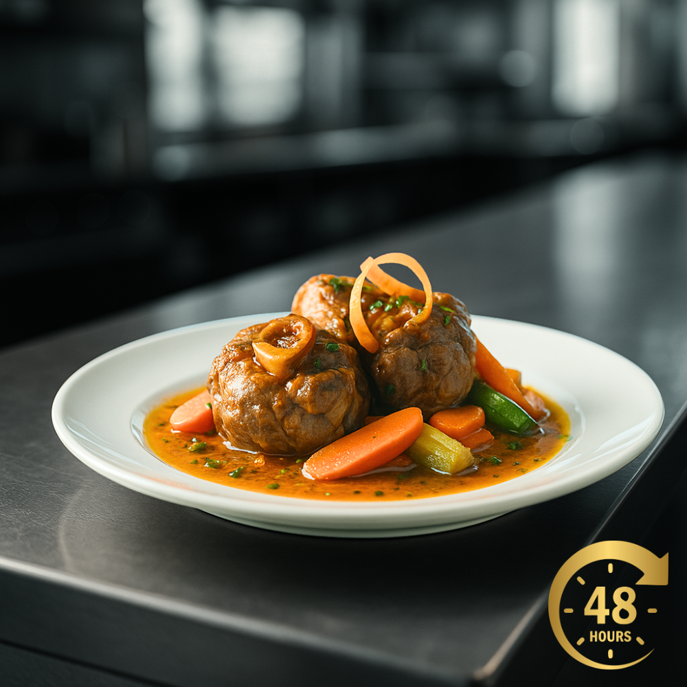 Jarret de veau fondant, nappé de fromage gratiné, servi avec un gratin dauphinois onctueux.
