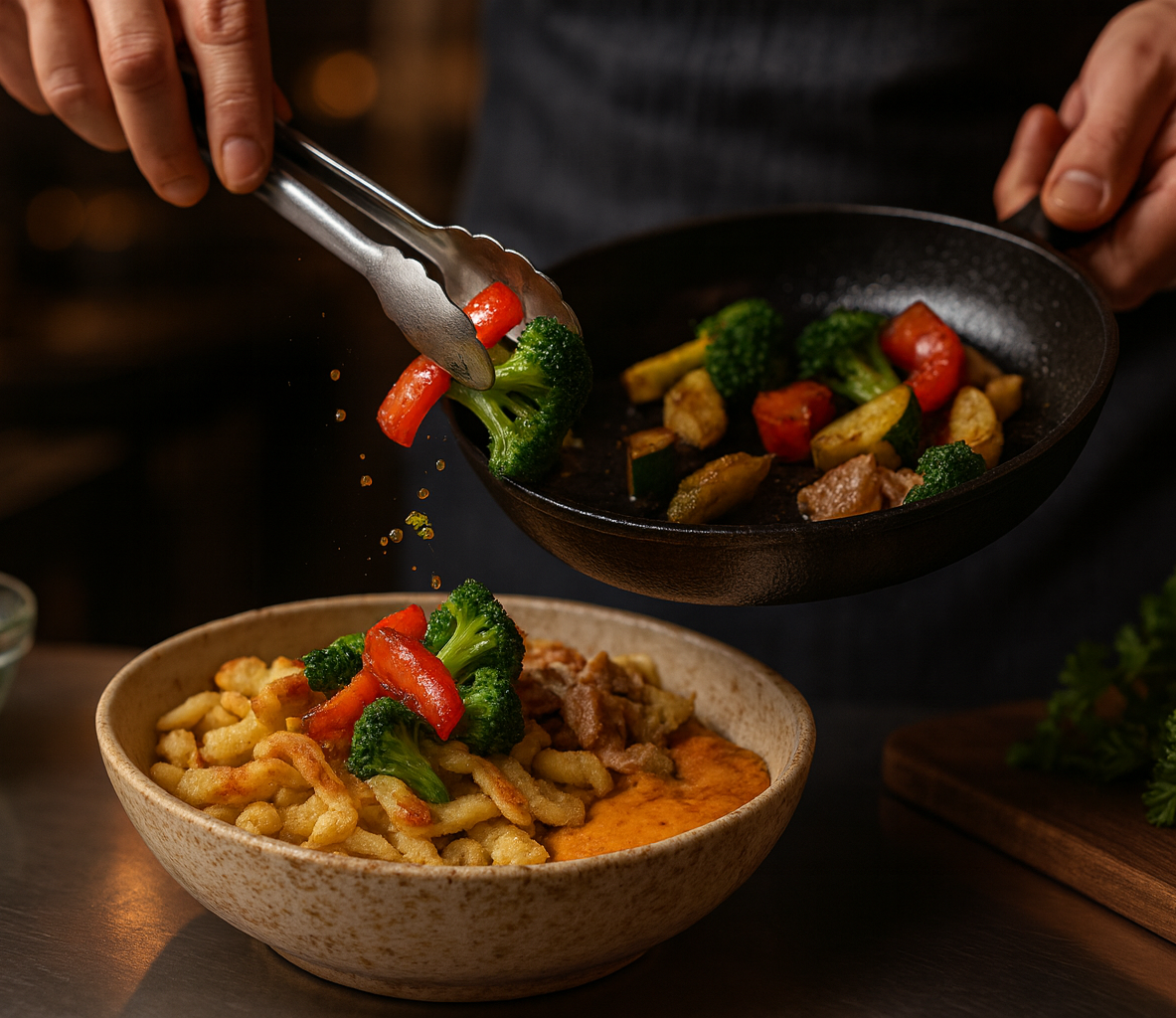 Le Spezy Bowl marie des spaetzle grillées à la perfection, mêlées à des viandes fondantes, légumes croquants et sauces au choix. Un bol généreux, alsacien et moderne.